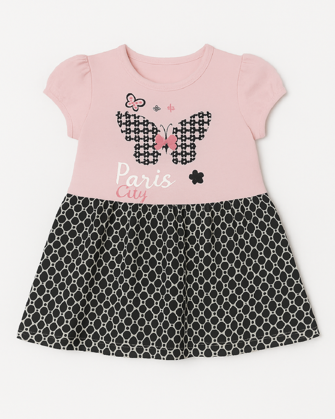 Adorable baby frock with puff sleeves and a stylish contrast skirt — comfy and cute for everyday wear.