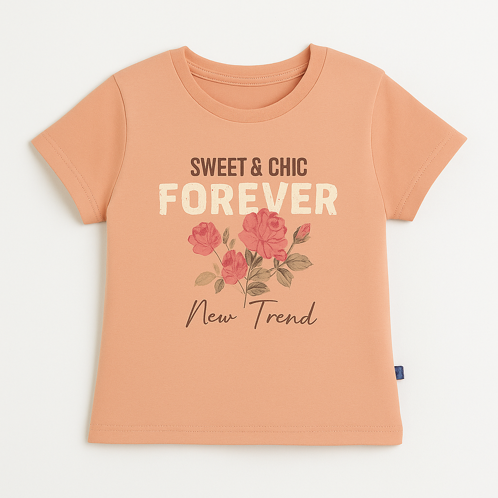 Soft peach tee with floral graphic and “Sweet & Chic Forever” slogan.