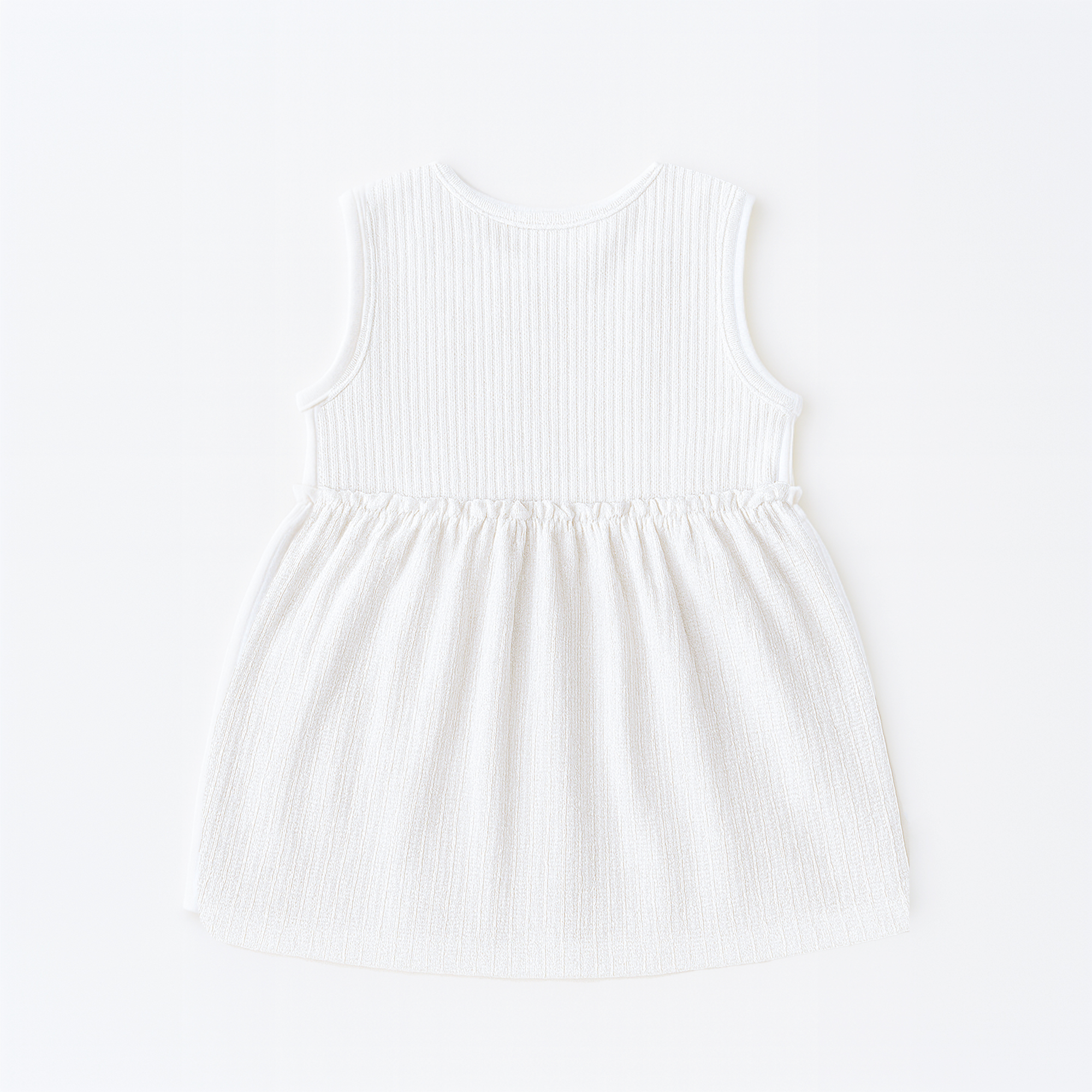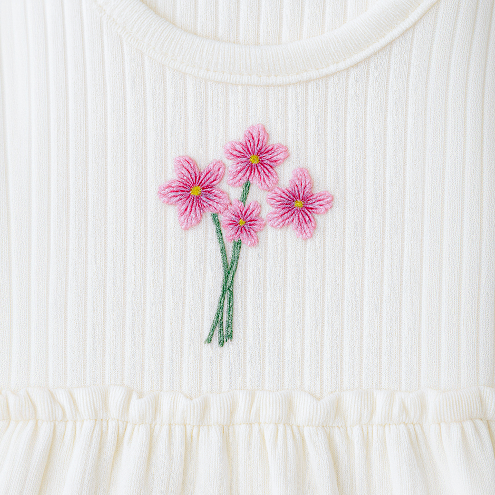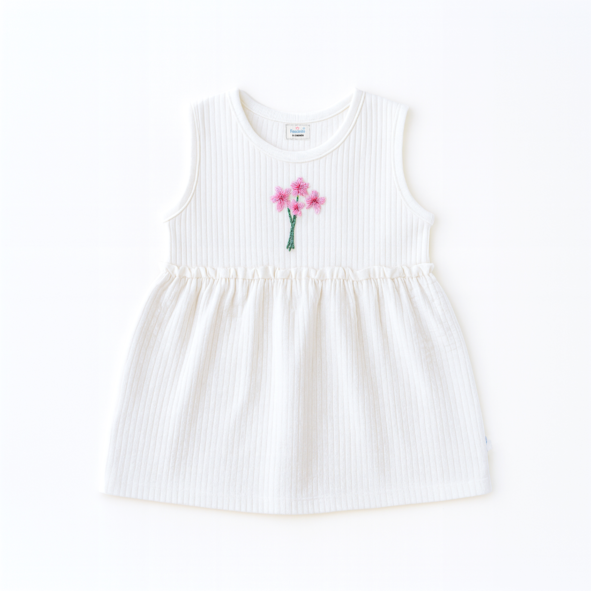 Gracefully simple and full of charm, this sleeveless white frock from Fascinito Baby & Kids brings pure innocence to life. Crafted from soft ribbed cotton, it features a gentle gathered waist and a delicate bouquet embroidery that adds just the right touch of sweetness. Designed for comfort and cuteness, it’s perfect for warm days, special photos, or those little twirls of joy that brighten every moment.