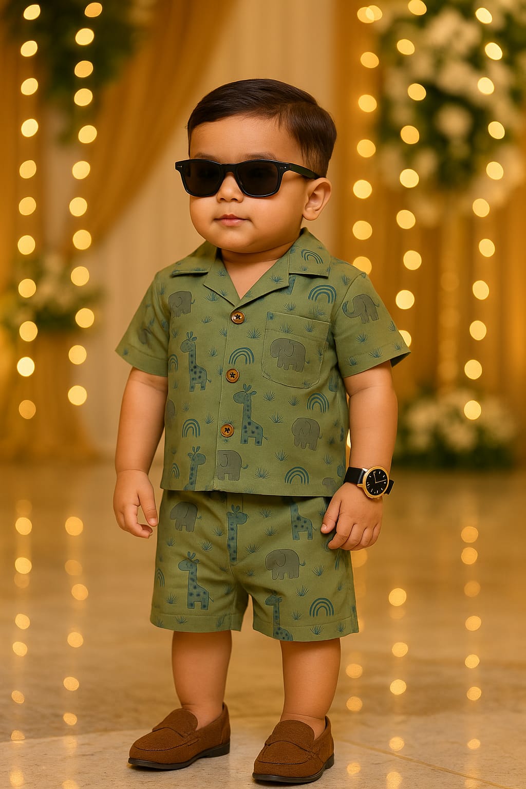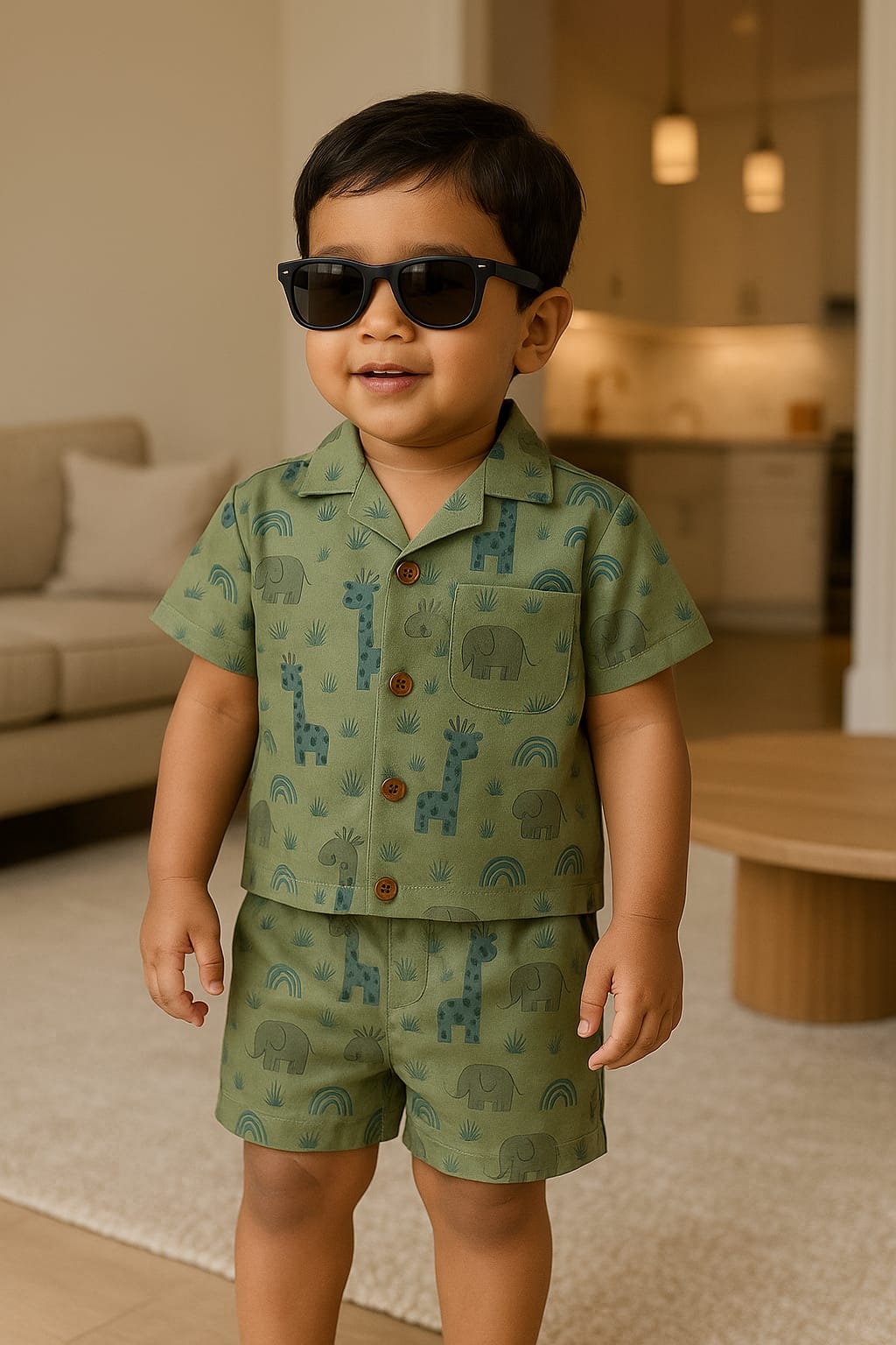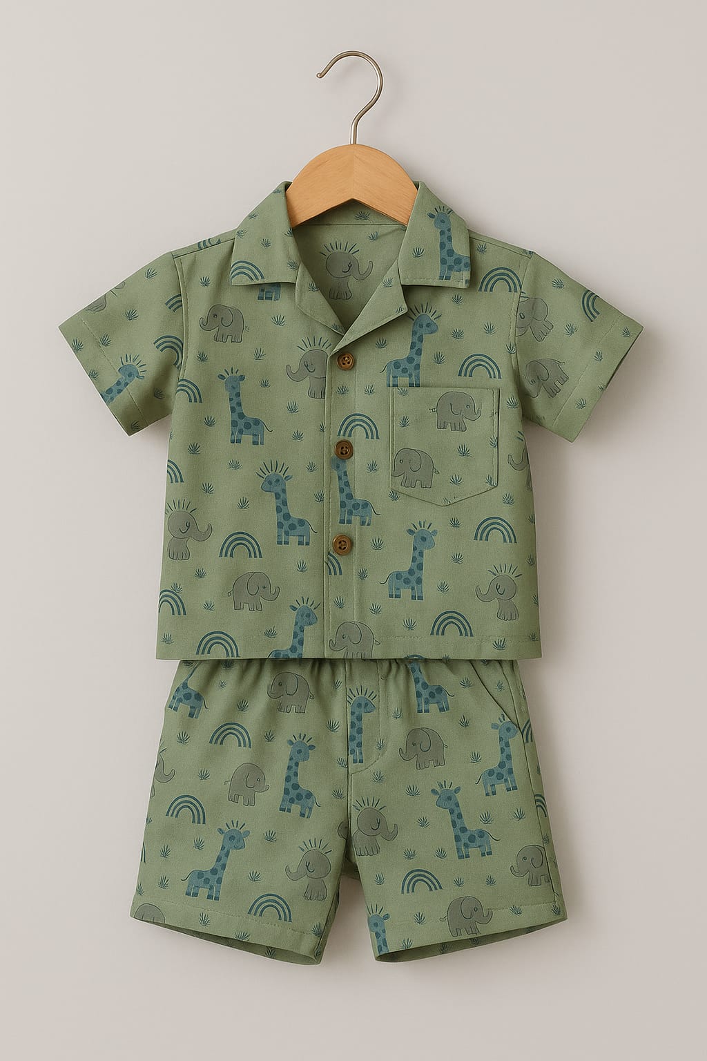 Dress your little one in this adorable 2-piece printed co-ord set – perfect for both casual outings and special functions. The soft olive-green fabric is decorated with playful giraffe, elephant, and rainbow prints, giving it a fun yet classy vibe.100% ORGANIC COTTON MUSLIN