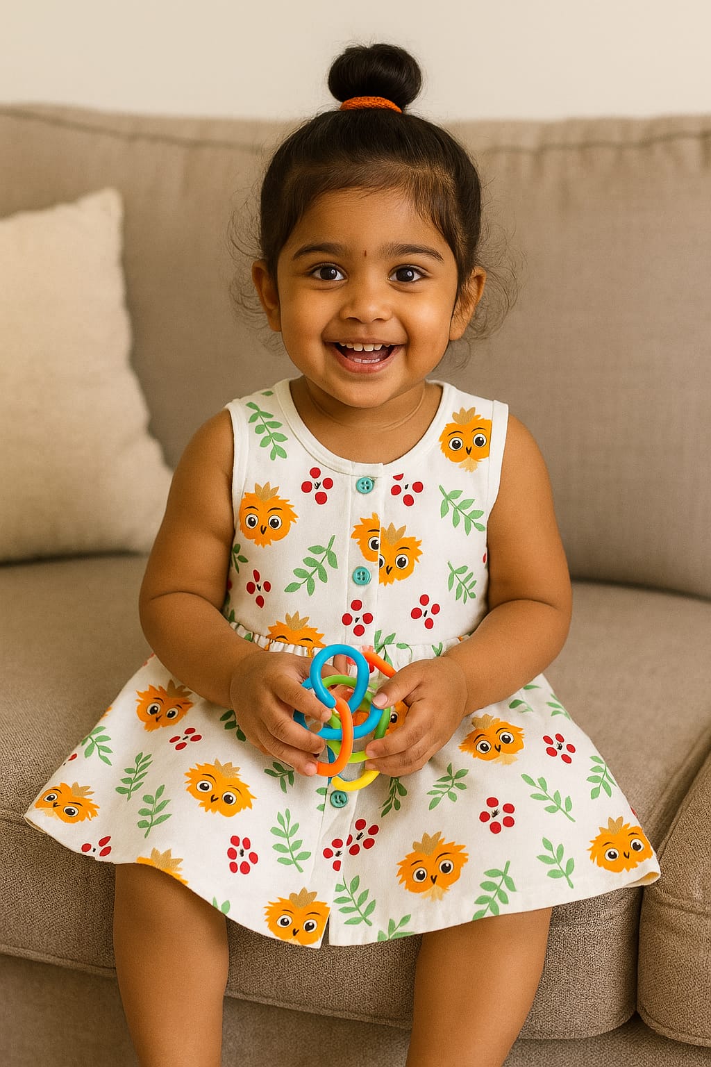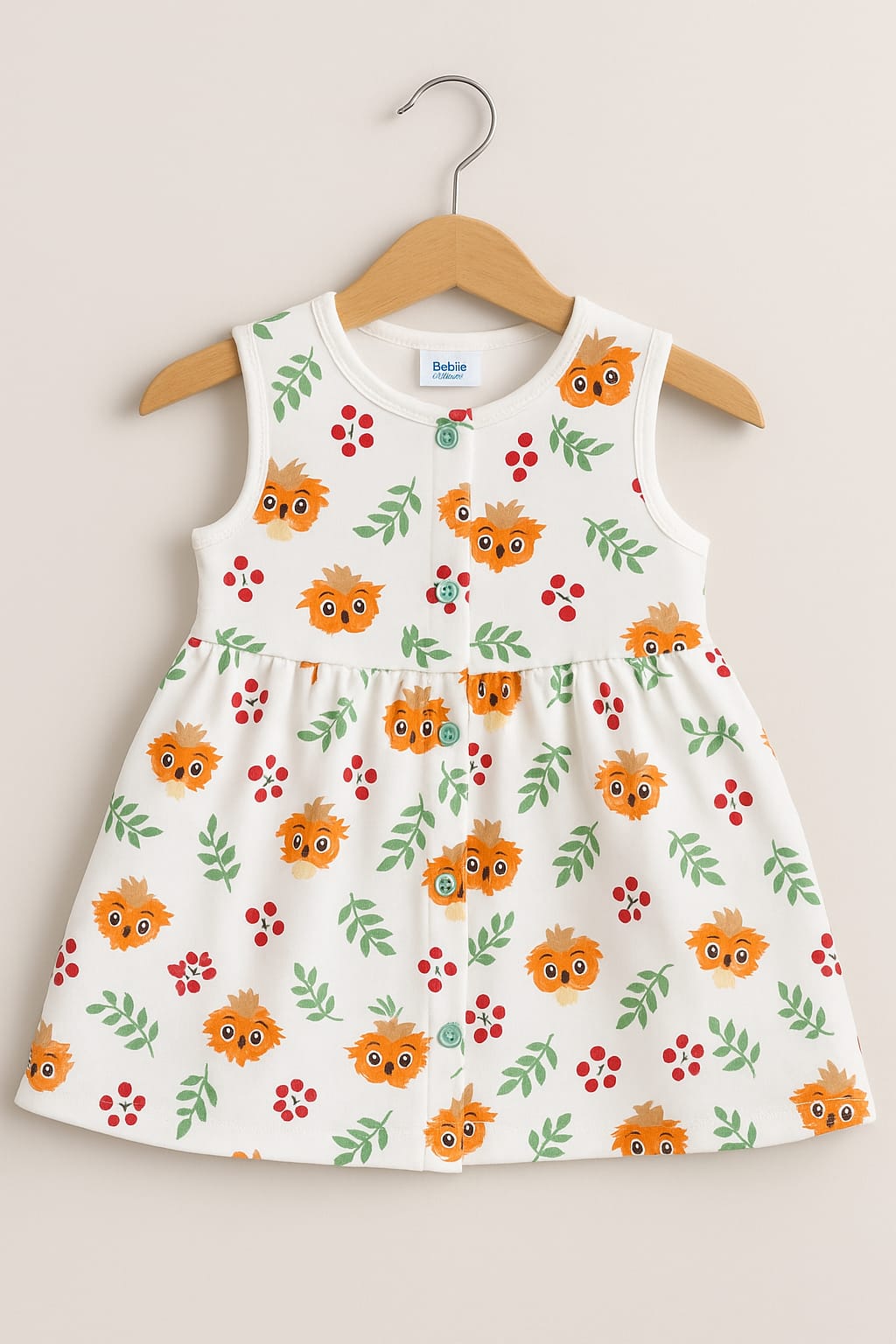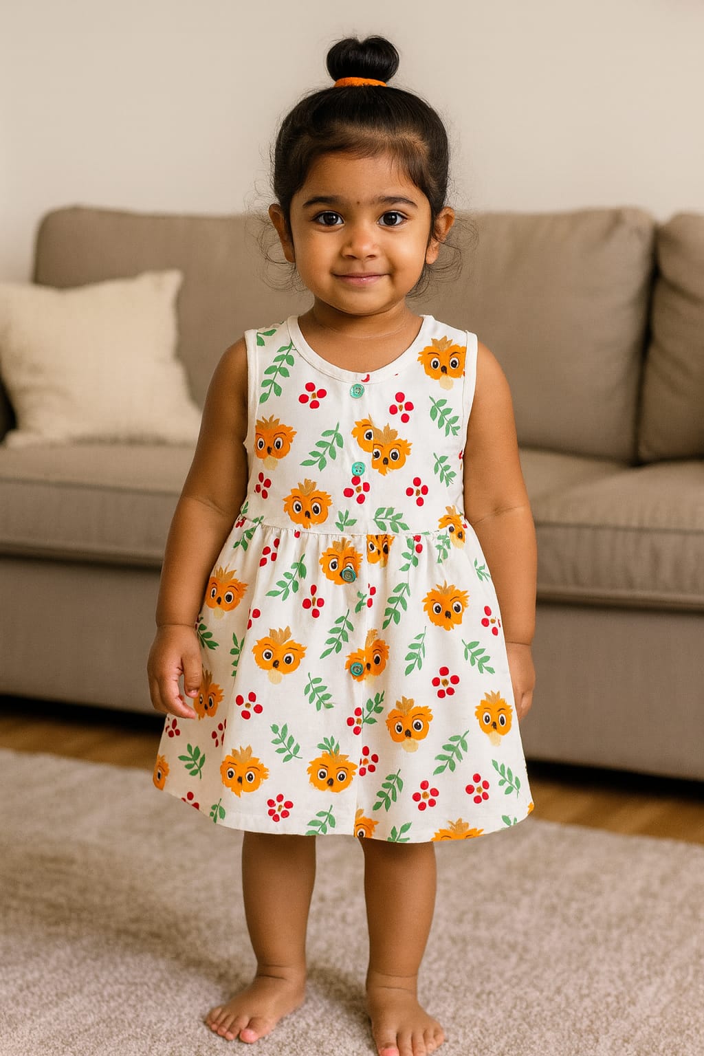 Sleeveless cut – keeps it airy and perfect for warm weather.Round neckline – classic and comfortable for easy wear.Front button closure – practical and adds a touch of detail.A-line / gathered waist – gives a flared, flowy look, allowing free movement.Playful print – bright orange owl faces, green leaves, and red berries create a cheerful, child-friendly design.Knee-length – ideal for toddlers, making it both stylish and practical for playtime.It’s a casual summer frock style, often chosen for everyday wear, playdates, or outings because it’s light, easy to move in, and looks super cute.