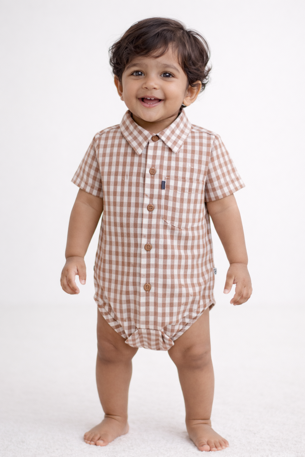 Dress your little one in timeless charm with the Classic Gingham baby playsuit from Fascinito Baby & Kids. Featuring a traditional brown and white checkered pattern, this short-sleeve infant bodysuit brings a refined yet adorable look for special occasions. Crafted from breathable, high-quality cotton, it ensures a soft and gentle feel against delicate skin, making it perfect for family gatherings, celebrations, and smart-casual outings.
